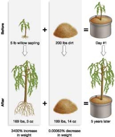 จากผลการทดลองของ Jean Baptista van Helmont นักวิทยาศาสตร์ ได้ทำการทดลองชิ้นหนึ่ง เมื่อปี ค.ศ.1639-1644 เพื่อหาดูว่าต้นไม้ที่เติบโตนั้น ใช้สารในดินจำนวนเท่าไรในการสร้างการเจริญเติบโตเป็นไม้ต้นใหญ่ โดยการปลูกต้น Willow ในที่ปิด โดยน้ำหนักทั้งต้นแรกเริ่ม 5 ปอนด์ ในกระถางที่ใส่ดิน (น้ำหนักแห้ง) 200 ปอนด์ เมื่อเวลาผ่านไป 5 ปี ต้น Willow ก็เติบใหญ่ จากนั้นจึงนำเอาไม้ต้นนั้นมาชั่งหาน้ำหนักปรากฏว่าน้ำหนักของดินที่ทำให้แห้งแล้วยังคงมีน้ำหนักใกล้เคียงเท่าเดิม ขาดหายไปแค่ 1 ออนซ์เท่านั้นแสดงว่าต้น Willow ใช้สารในดิน (แร่ธาตุ) ไปแค่ 2 ออนซ์เท่านั้นในการเติบโตได้น้ำหนักเพิ่มขึ้นถึง 169 ปอนด์กับ 3 ออนซ์ หรือเทียบได้ว่าน้ำหนักต้นไม้เพิ่มขึ้น 3400% และดินหายไปเพียง 0.00063% เท่านั้นเองนี่จึงเป็นเครื่องชี้ให้เห็นว่า
