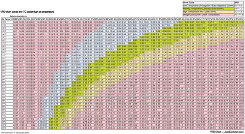 จากตารางจะเห็นได้ว่าถ้าเลี้ยงที่ RH 50% อุณหภูมิอยู่ที่ 22 องศาเซลเซียส ถือว่ามีค่าต่ำ ต้องระวังไม่ให้ต้นพืชเครียด ต้องบอกก่อนว่าเราไม่ได้ต้องการให้ทำให้ได้ค่าเป๊ะๆนะ อย่างน้อยค่า VPD จะได้เป็นตัวชี้บ่งความเหมาะสม และเราก็จะได้รู้ว่าตอนนี้สภาพแวดล้อมดึงความชื้นออกจากต้นพืชมากและเร็วแค่ไหน